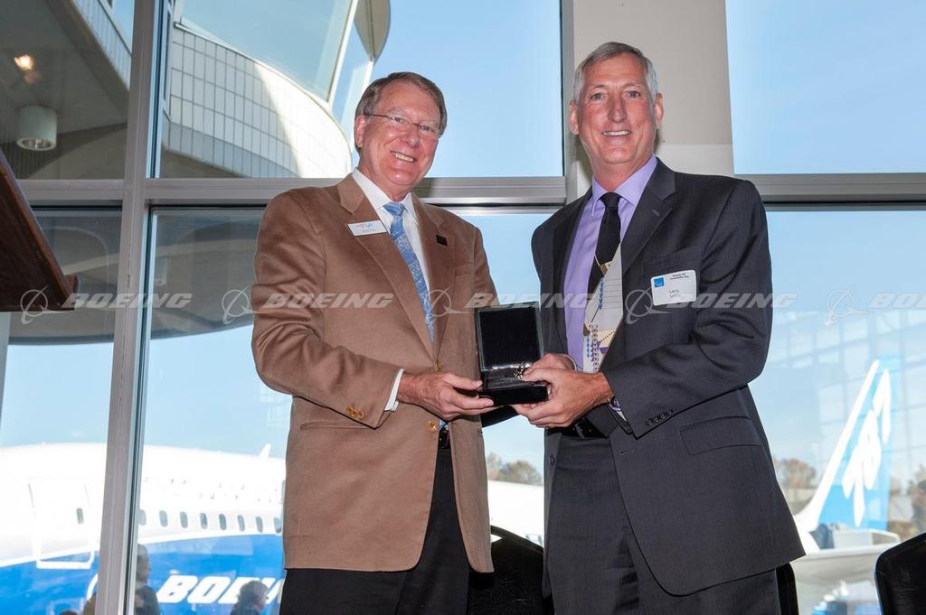 787 Vice President and General Manager Larry Loftis (right) hands the ceremonial keys over to The Museum of Flight President and CEO Doug King.