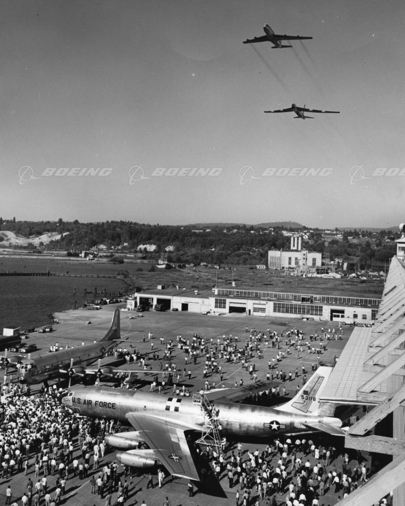 Dash 80 and B-52 Fly Over KC-135 Rollout, with KC-97 in Background