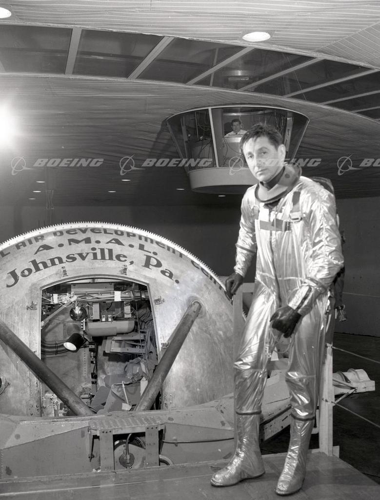 North American Aviation test pilot Scott Crossfield testing a new space suit in the centrifuge at the Naval Air Development Center in Johnsville, Pennyslyvannia, December 17, 1957. Testing was done in preparation for testing the X-15 research airplane.
