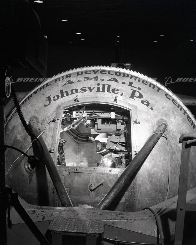 North American Aviation test pilot Scott Crossfield testing a new space suit in the centrifuge at the Naval Air Development Center in Johnsville, Pennyslyvannia, December 17, 1957. Testing was done in preparation for testing the X-15 research airplane.