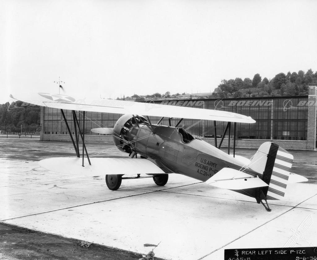 U.S. Army Boeing P-12C on runway September 6, 1930. Designed during 1928, the carrier-based F4B-series for the U.S. Navy and the similar P-12 for the U.S. Army were the most widely used fighter/bomber biplanes between the two world wars. Crews in these early warfighters were trained to drop bombs and then engage in dogfights.