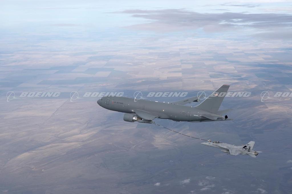 Boeing’s KC-46A tanker test aircraft refuels an F/A-18 with its hose and drogue system as part of Milestone C testing.