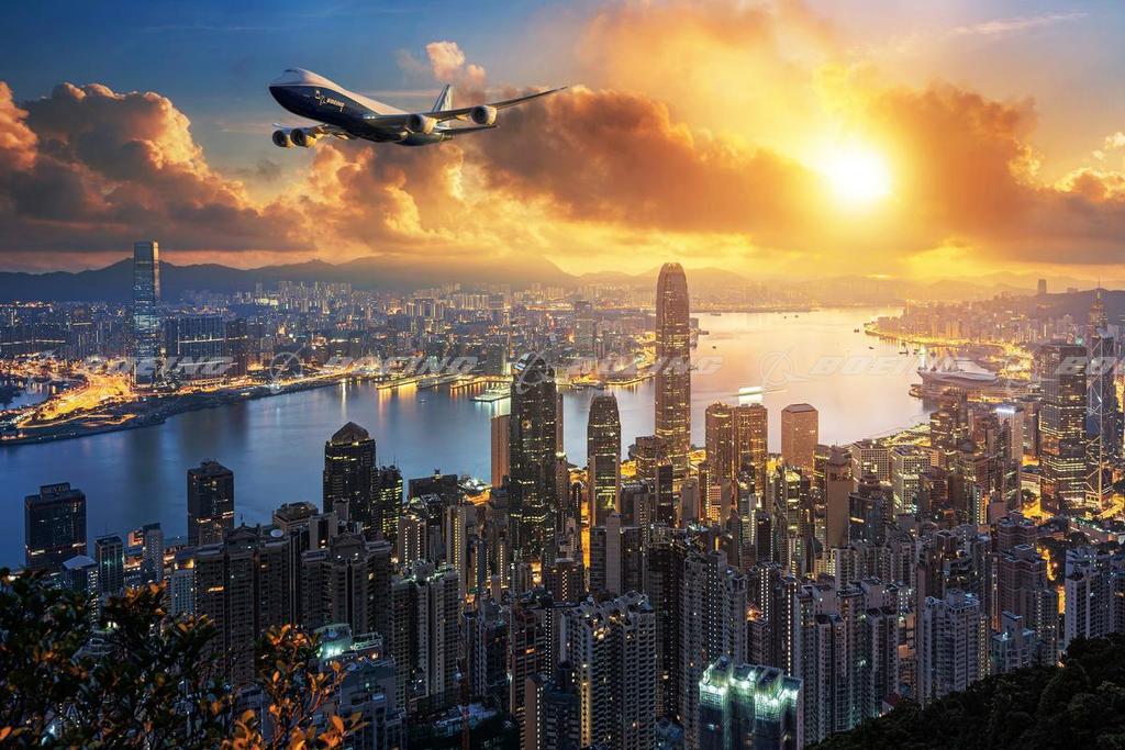 747-8F flying over Hong Kong - view of Victoria Harbor from Victoria Peak.