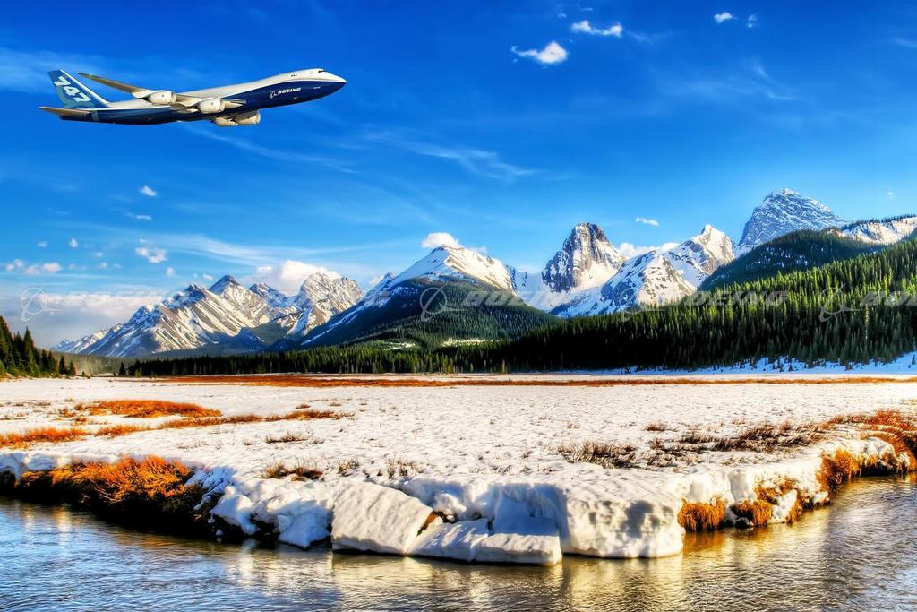 747-8F Flying Over Snow-Covered Mountain Meadow