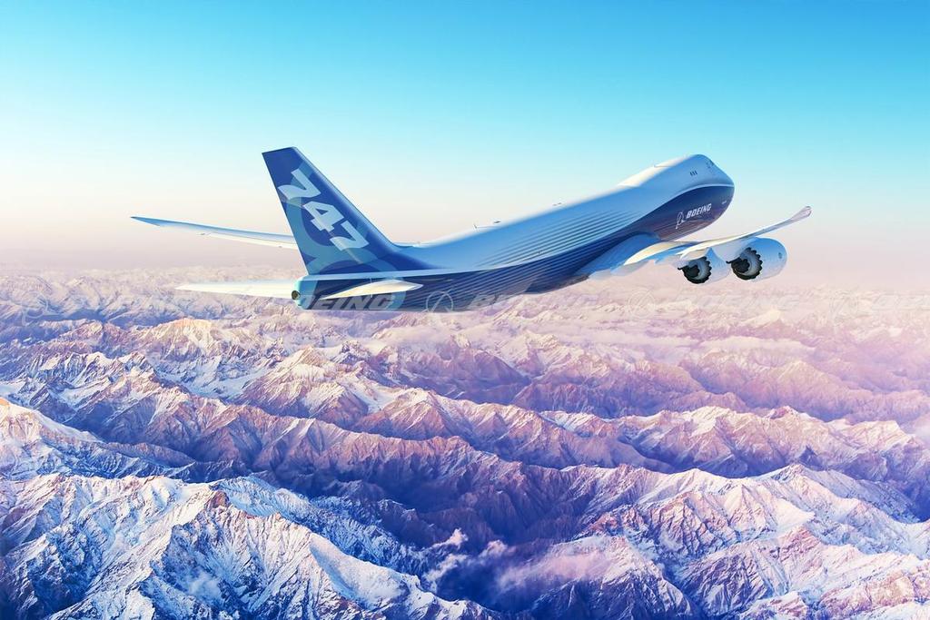 747-8F Flying Over Snow-Covered Mountain Meadow