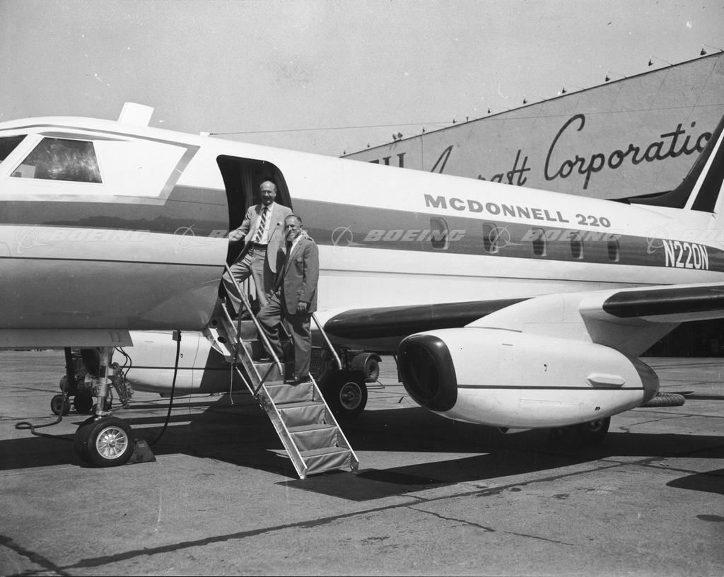 James S. McDonnell (right), founder of McDonnell Aircraft, standing on the stairs of the Model 220.