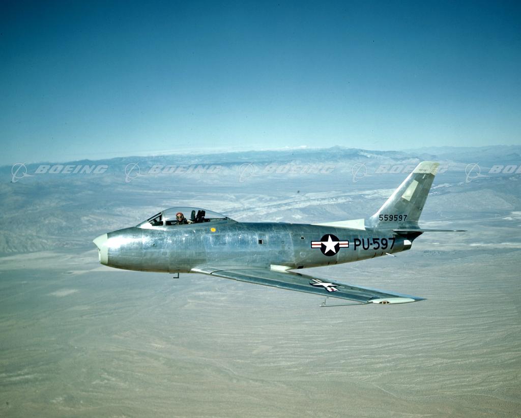 The North America F-86 Sabre jet was America’s first swept-wing jet fighter. The single-seat jet was the world’s first-line fighter for more than a decade after it was designed. More than 6,000 F-86s were manufactured by North American's Los Angeles, Calif., and Columbus, Ohio, divisions. The K model, manufactured in Turin, Italy, by Fiat, was flown by NATO forces. Four models of the craft (F-86A, E, F and H) were day fighters or fighter bombers, while the F-86D, K and L versions were all-weather interceptors. Successive models of the daylight versions, all designed to destroy hostile aircraft in flight or on the ground, were equipped with more powerful engines and armament systems that ranged from bombs and rockets to machine guns and cannon. Various models of the Sabre held world's speed records for six consecutive years, setting five official records and winning several National Aircraft Show Bendix Trophies. During the Korean conflict, the Sabre Jet flew 82,177 sorties during 32 months of combat and troop support. The version built for the Navy and Marine Corps was called the FJ-2 Fury.