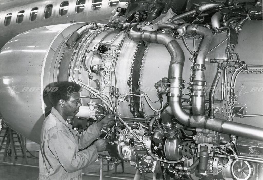 July 1980, engine mechanic Thomas Hadley Jr., works on a 737-200’s JT-8D engine at the Boeing Renton plant.