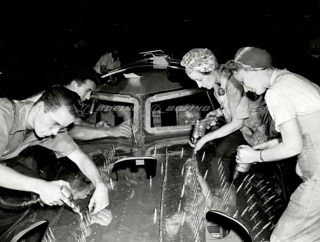 Boeing employees working together on B-17 assembly.