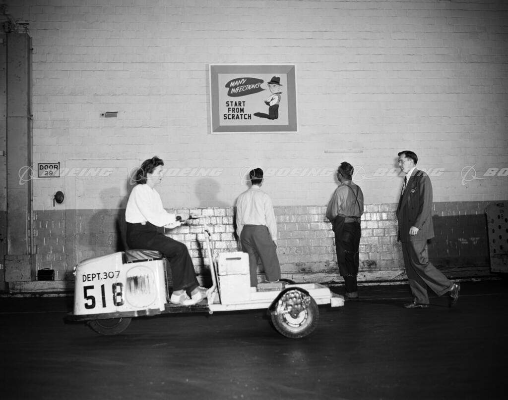 Poster in factory for safety. 1 woman on scooter and 3 men.