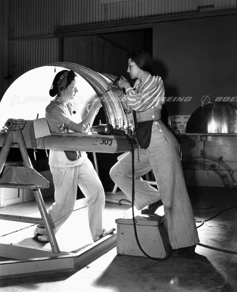 Using the Buck Rogers Gun, a woman inserts a rivet, while another woman is positioned on the inside of the airframe using a bucking bar to flatten the end of the rivet while tightening it.