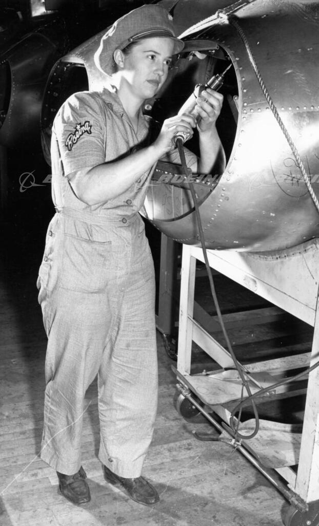 Harper's Bazaar. Boeing employee, Elsie Bachmann, drilling tail turret of a Boeing B-17.